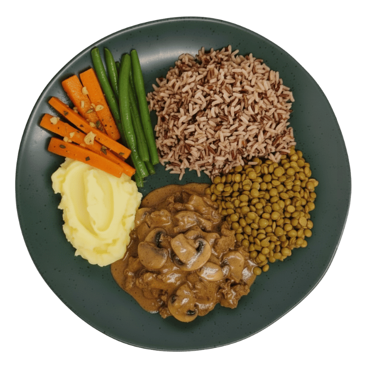 Acompanhado por um Arroz 7 Grãos e Lentilha Verde, oferecendo um perfil completo de fibras e proteínas. O acompanhamento se completa com o cremoso Purê de Batata e Cenoura e a leveza da Vagem, resultando em uma refeição nutritiva e de sabor inigualável.