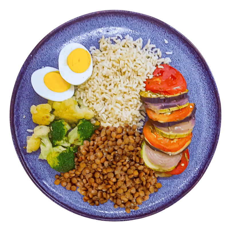 Berinjela, tomate italiano, abobrinha e cebola roxa em rodelas, temperados com azeite de oliva, Sal do Himalaia, alho e alecrim. Montados e assados no forno até ficarem macios e dourados.