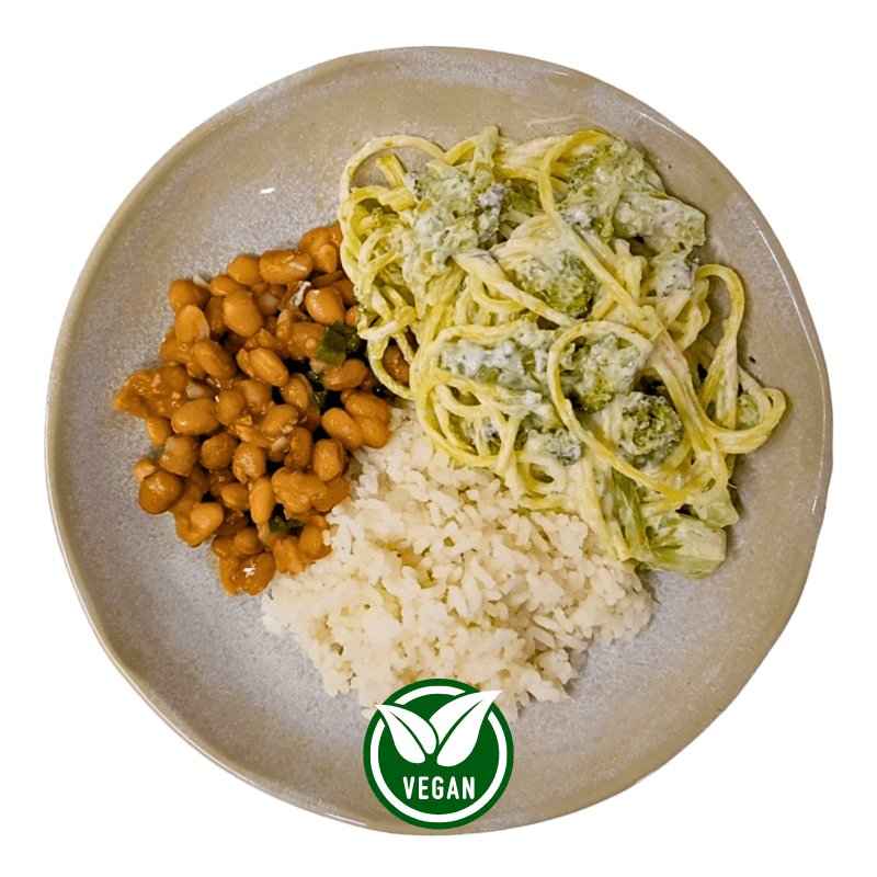 Espaguete de arroz cozido em água fervente com Sal do Himalaia. Alho, cebola e manteiga vegetal refogados, creme de leite vegetal e queijo vegetal adicionados, juntamente com a água do cozimento do macarrão até derreter. Espaguete e brócolis cozido no vapor e refogado com alho e azeite de oliva, misturados ao molho.