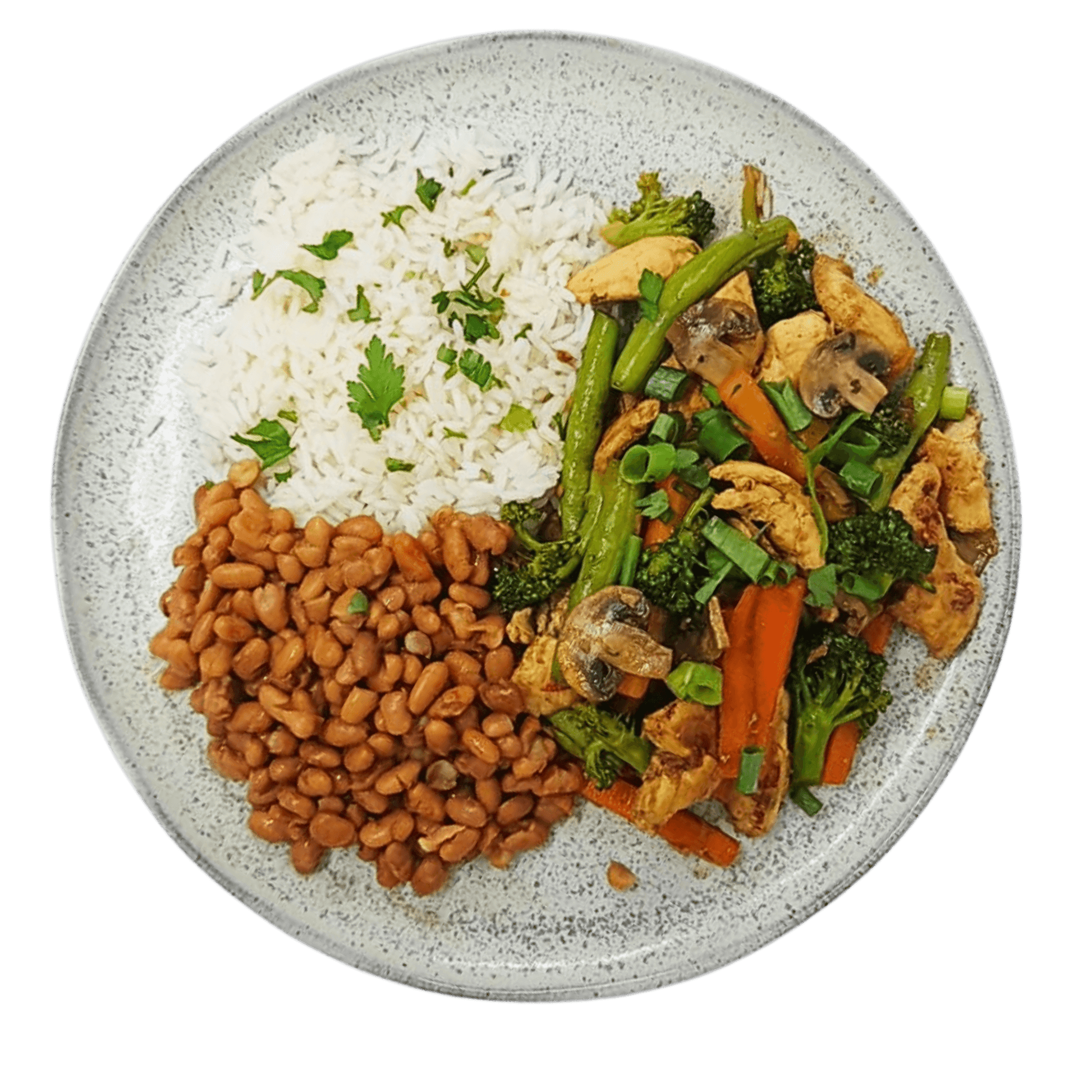 Filé de sassami orgânico refogado com alho natural, Sal do Himalaia, azeite de oliva extravirgem e páprica doce. Legumes como cenoura, vagem, champignon e brócolis cozidos no vapor são adicionados, criando um prato leve e saboroso.
