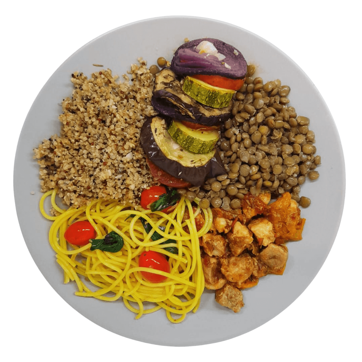 Espaguete cozido em água com Sal do Himalaia, refogado com alho, azeite de oliva, salsinha e tomate cereja salteado.
