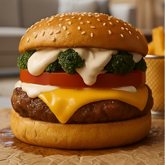 Um hambúrguer leve, saboroso e cheio de frescor. No pão sem glúten e lactose, fofinho e tostado na chapa com manteiga ghee e gergelim, Hamburger Blend de carnes nobres (aprox. 100g). Por cima, queijo vegetal cremoso tipo cheddar, brócolis levemente refogado, tomate fresco e cebola natural picada, que equilibram cada mordida com frescor e textura. Nosso creme de maionese vegana,. Sem glúten, sem lactose, é prazer e leveza em cada mordida.