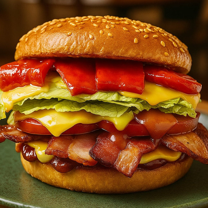 Pão sem glúten e lactose, levemente tostado na chapa com manteiga ghee, vem bacon artesanal crocante 120g aprox. Queijo tipo cheddar vegetal derretem suavemente sobre o bacon. Folhas de alface americana, rodelas de tomate fresco, cebola-branca refogada, champignon salteado com alho e pimentão refogado com alho equilibram cada mordida com frescor, doçura e textura. Acompanhado de Ketchup Vegano Sem glúten, sem lactose , é frescor e prazer em cada mordida.