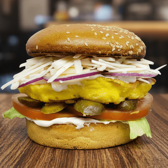 Pão sem gluten tostado na chapa com a leveza da manteiga Ghee, recheado com uma omelete fofinha feita com ovos orgânicos e coberta por queijo mussarela ralado derretido. O frescor fica por conta da salada completa, alface americana crocante, rodelas de tomate, fatias finas de pepino e cebola roxa crua para realçar o sabor. Finalizado com maionese e ketchup vegetal.